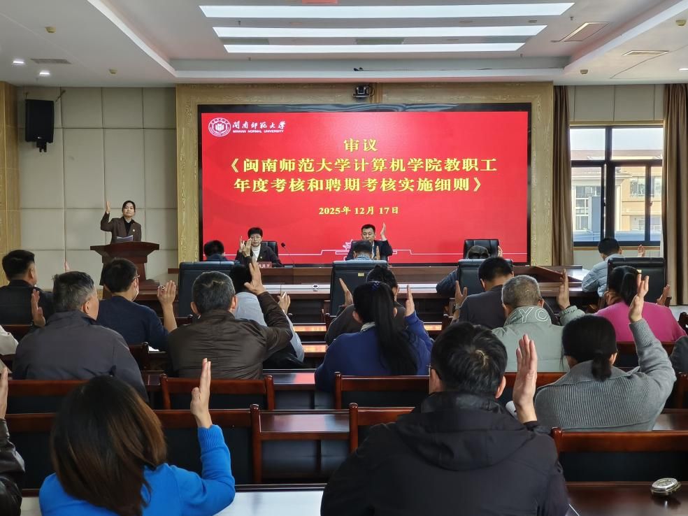 会议听取了周豫苹副院长关于《闽南师范大学计算机学院教职工年度考核和聘期考核实施细则》起草过程、文件内容、征求意见等有关情况的说明。经全院教职工审议,会议采取举手表决的方式,一致通过《闽南师范大学计算机学院教职工年度考核和聘期考核实施细则》。该办法自2025年度开始实施。