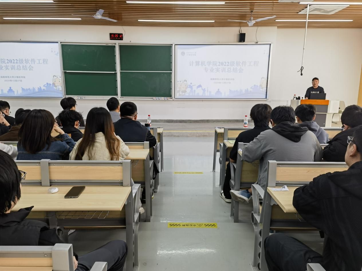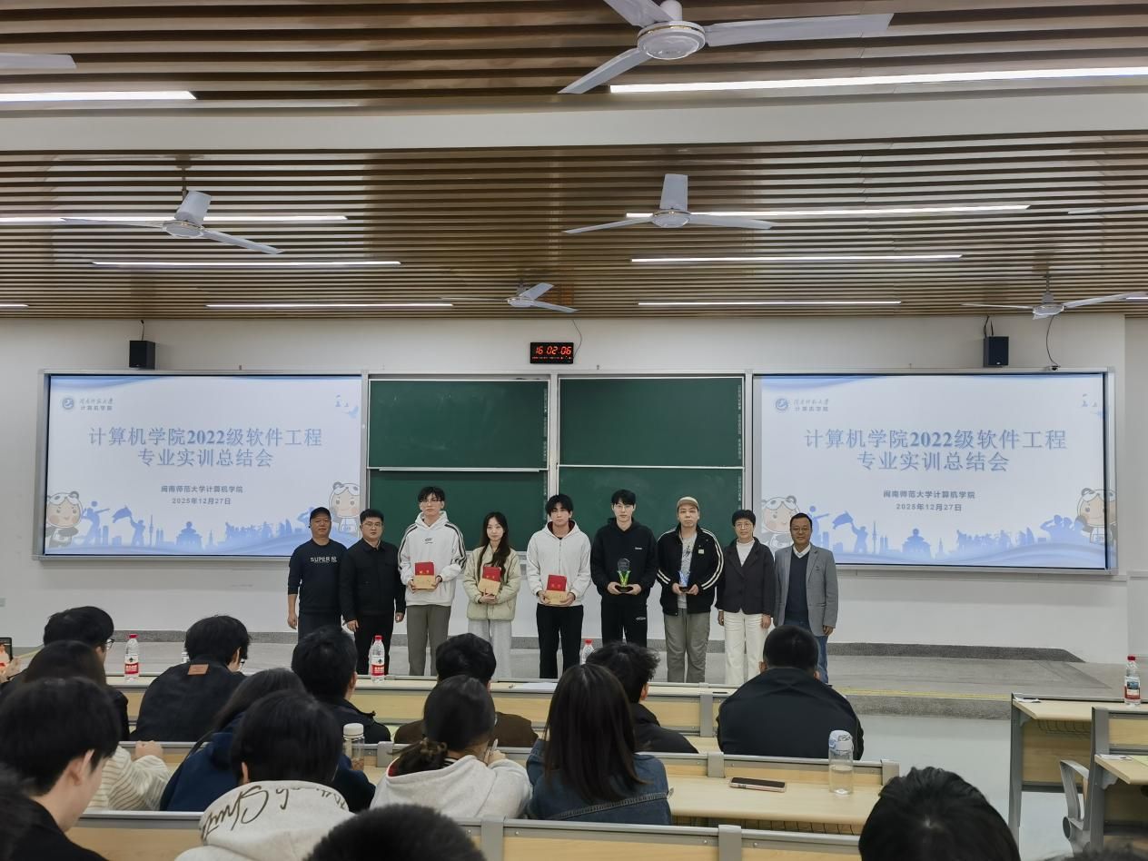 2025年12月27日下午,计算机学院2022级软件工程专业本科生实训总结暨成果汇报会在砺志215顺利召开。学院副院长周豫苹、院长助理王育齐、厦门欧米克网络科技有限公司负责人、福州榕智信息科技有限公司负责人、2022级辅导员以及2022级软件工程本科生共同出席本次会议,会议由学生代表李亚梦主持。