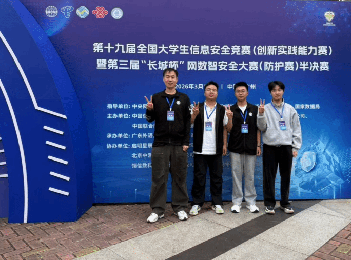 3 月 22 日,第十九届全国大学生信息安全竞赛(创新实践能力赛)暨第三届 “长城杯” 网数智安全大赛(防护赛)半决赛(广东赛区)在广州圆满举办。由我院农强老师指导,黄咏珂(2023级本科生)、李瑞(2023级本科生)、郑驿枫(2025级研究生)、邱律清(2025级研究生)组成的Sign_1n战队,荣获广东赛区三等奖。